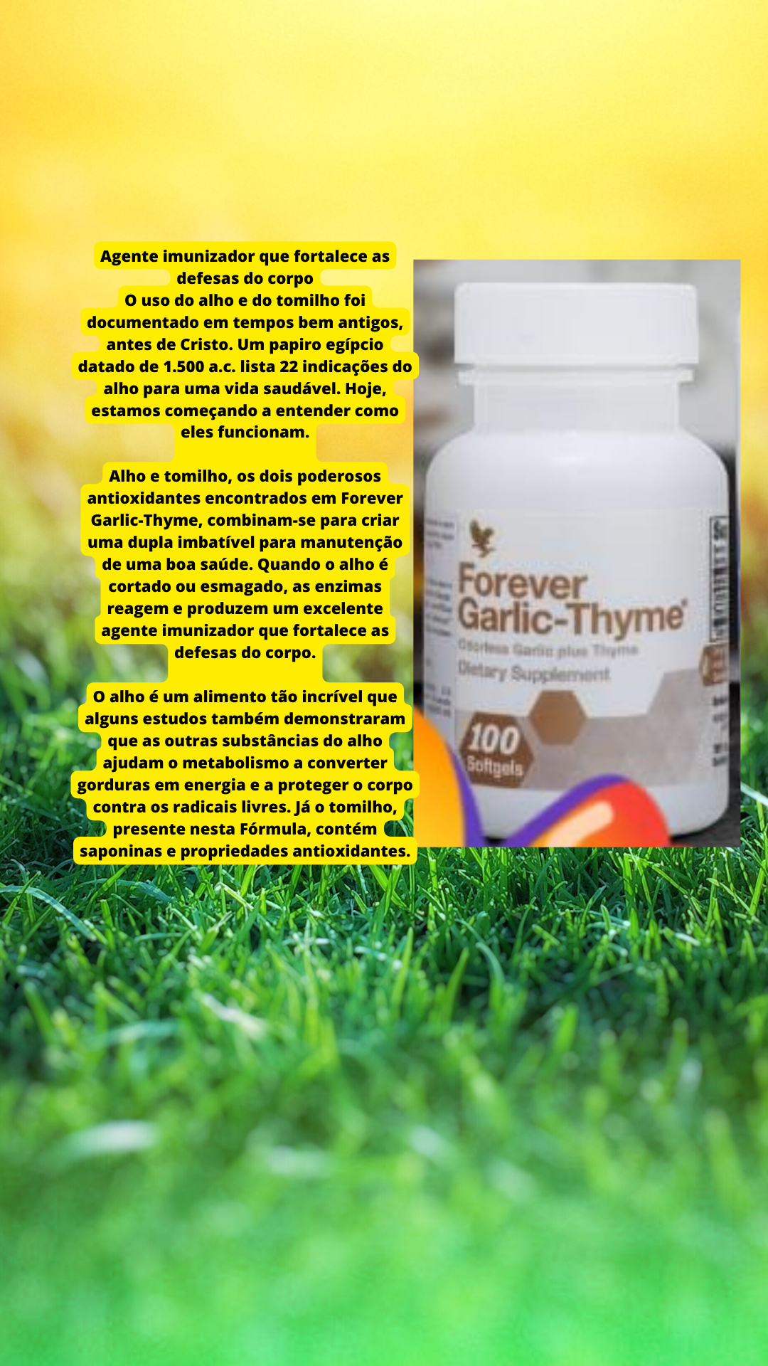 Alho e tomilho, os dois poderosos antioxidantes encontrados em Forever Garlic-Thyme, combinam-se para criar uma dupla imbatível para manutenção de uma boa saúde. Quando o alho é cortado ou esmagado, as enzimas reagem e produzem um excelente agente imunizador que fortalece as defesas do corpo.